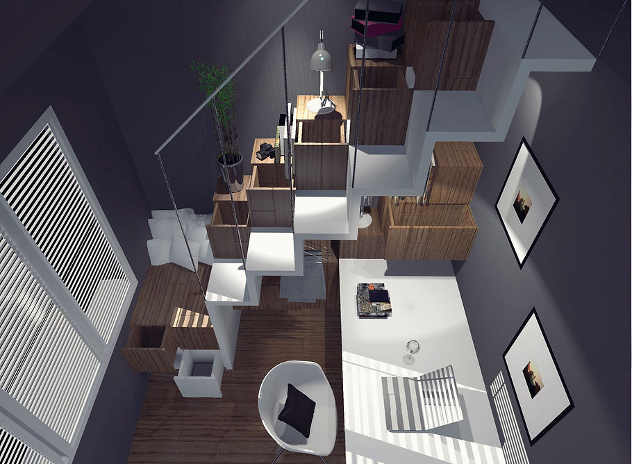 project. Création d'un escalier qui sert également de meuble de rangement et de bureau dans la chambre d'un adolescent et ce afin d'accéder à la mezzanine. Création également d'une banquette qui sert de garde corps et de séparation entre le salon et la cuisine, situé quelques marches en contre bas. Projet réalisé au sein du bureau HOSMOSE, Atelier d'Architectes.